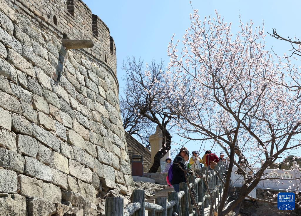 3月30日,游客在北京慕田峪长城景区赏花游玩。