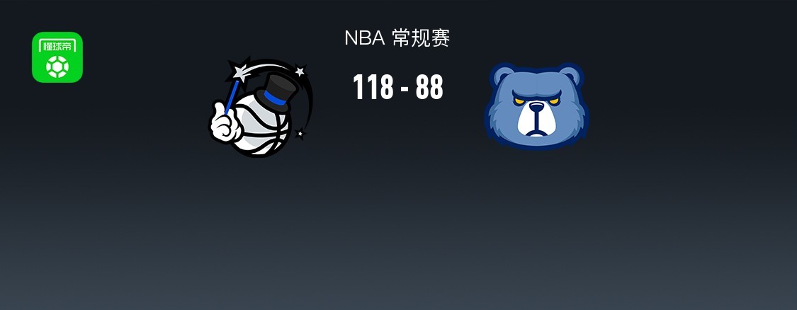 第四节魔术富尔茨拿下7分,灰熊古德温拿下14分,最终魔术118-88战胜灰熊