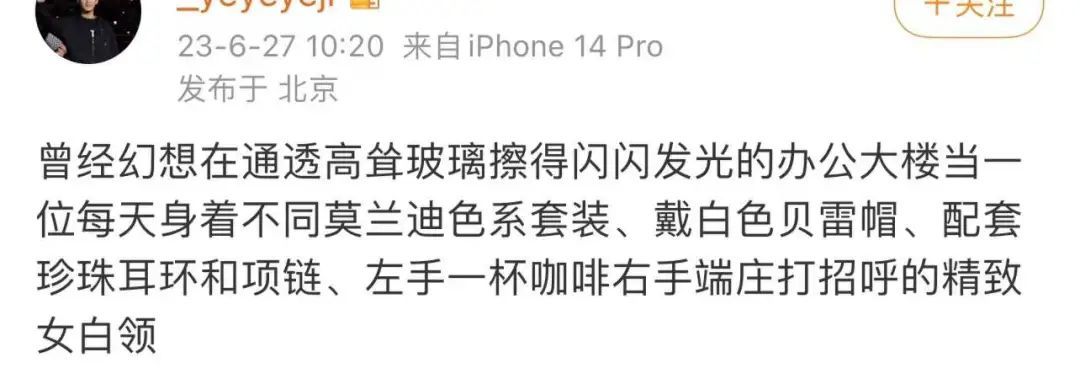 毕竟经常上班的人都知道,穿成都市丽人,不一定是都市丽人。每天穿得光鲜亮丽,满口黑话夹杂中英文,拿着美式拿铁星巴克提神的都市丽人,往往住在六环以外,跟人合租三室一厅。这个世界上哪有那么多的都市丽人,大家都是为了生活出力的人。