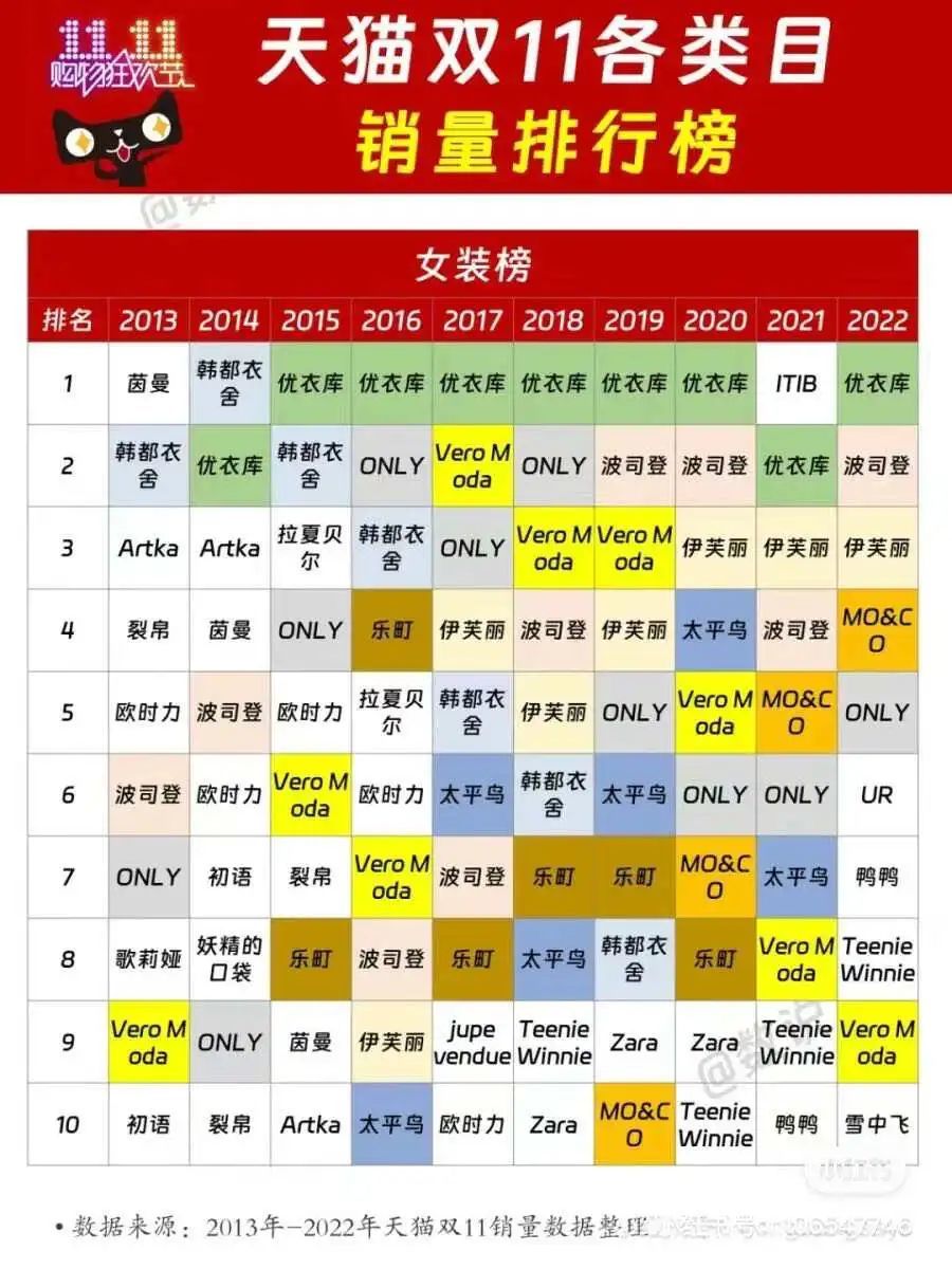 线上更明显,Vero Moda自打2017年拿到了销量第二,往后连年下滑,去年双11直接掉出前十了。真的是,一代江山一代女装。