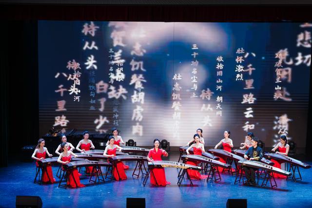 青年古筝演奏家陈蓓萱领奏,上师大玉兰筝团协奏的筝重奏《临安遗恨》由何占豪改编于2004年。乐曲以古曲《满江红》音调为核心素材,表达民族英雄岳飞壮怀激烈的报国之情。
