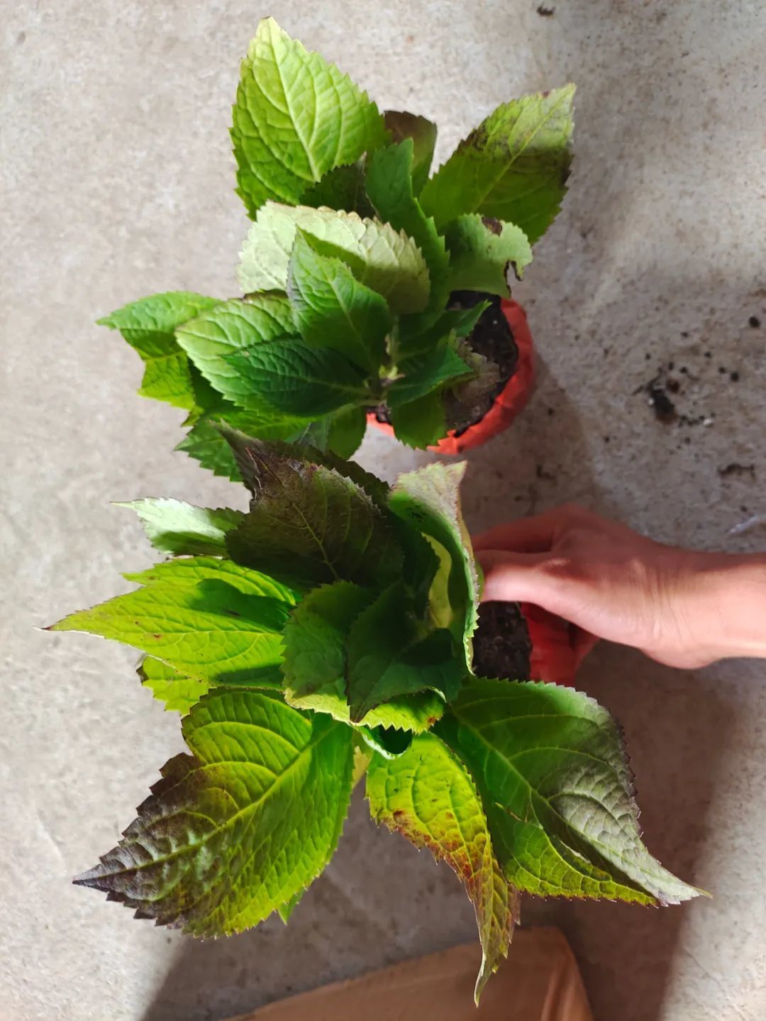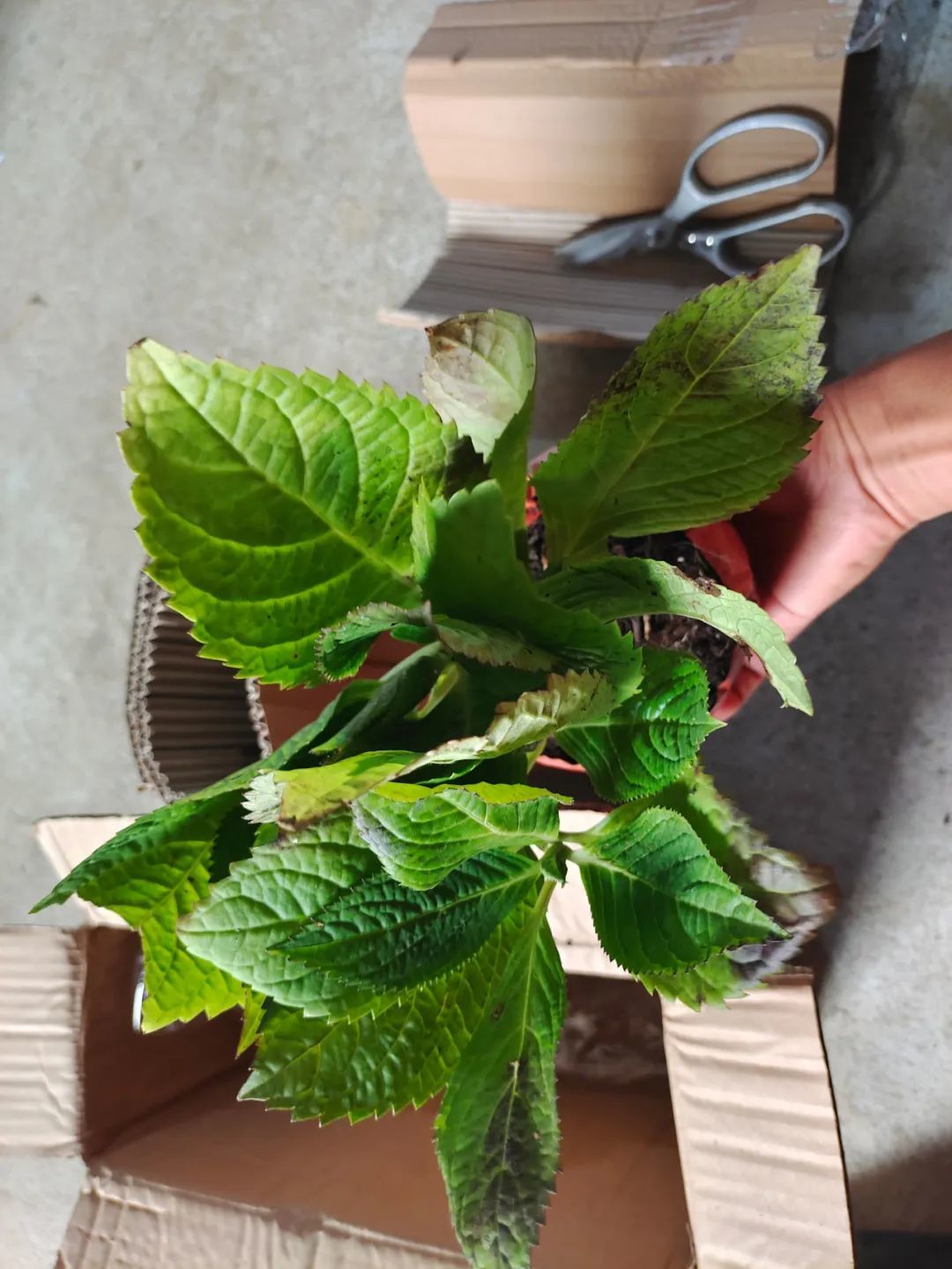 对于网购的盆栽绣球,无论是小苗还是比较大的盆栽苗,都是要先缓苗,就是放在通风透光,有一点柔和光照的位置,盆土摸起来特别干了,再给它浇透水。