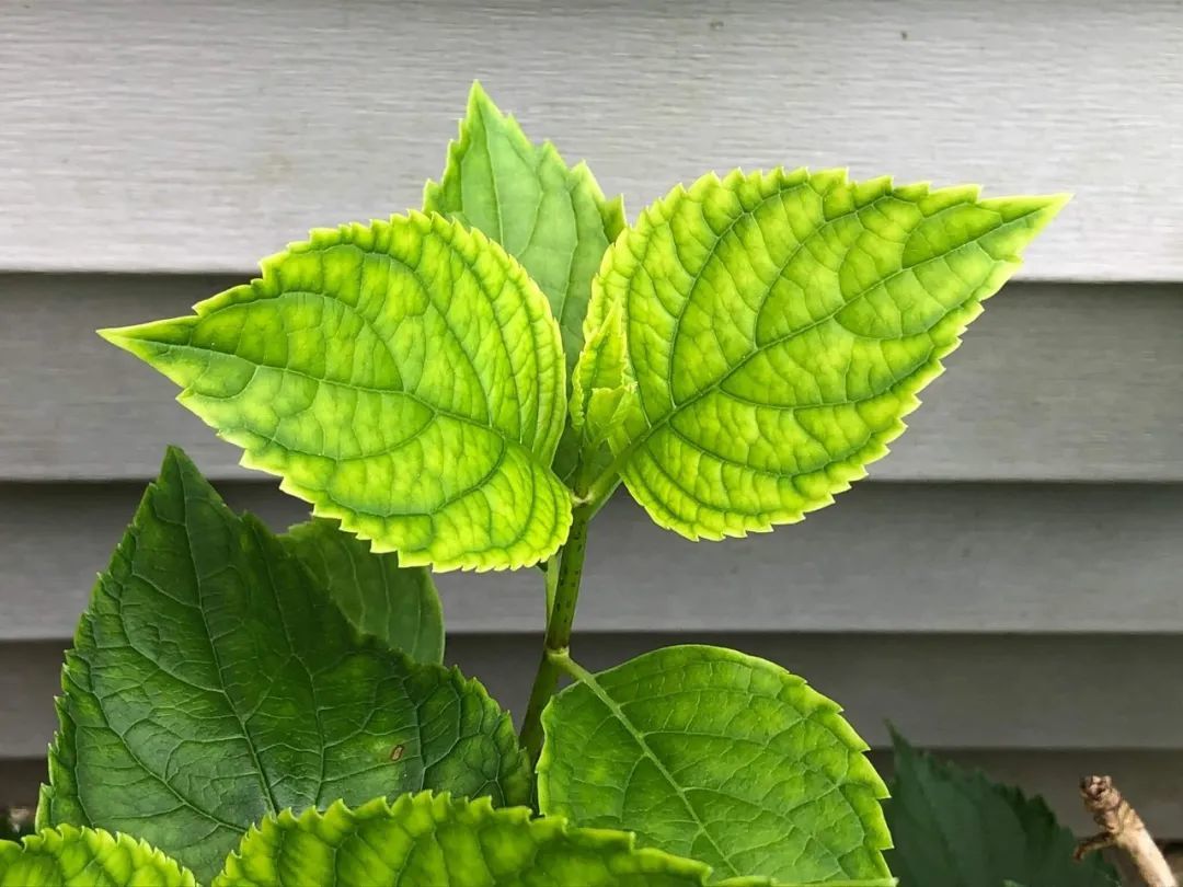 绣球春天的时候叶子很容易发黄,特别是新长出来叶子,老的叶子还翠绿,新叶发黄,叶脉还是翠绿的,那就是缺乏铁元素。