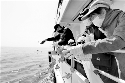 海风拂面、海鸥啼鸣,载有35份逝者骨灰的“国宾9号”撒海专用船缓缓驶向渤海湾。船舱内温馨祥和、庄严肃穆。海葬仪式上,礼仪人员敬献花篮,全体默哀致敬。逝者家属在哀婉的奠词中,追忆往事、缅怀亲人。船只到达指定海域后,家属在工作人员的指引下有序登上甲板,将亲人的骨灰轻轻撒入万顷碧波。伴随着落花瓣瓣,海葬逝者在广袤海洋的拥抱中,枕波长眠,回归自然。家属们泪目思亲,纷纷在祈福卡上写下寄语,表诉心中哀思之情。活动最后,全体人员为逝者祈福,启航仪式圆满结束。