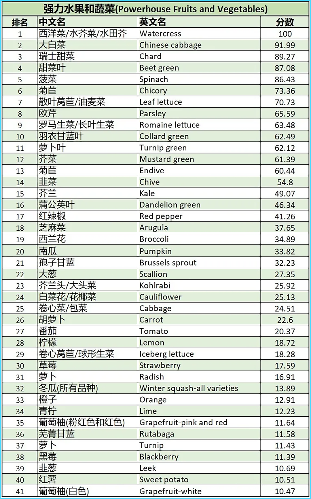 美国威廉•帕特森大学(William Patterson University)研究人员2014年发表在《预防慢性病》杂志上的一项研究,对世界上的蔬果进行了健康排名,它们根据这些蔬果的营养密度,对47种蔬果进行了评估,选出了和降低慢性病风险关系最密切的41种蔬菜,并把它们进行了排名,这个排名也叫做PFV(Powerhouse Fruits and Vegetables)——强力水果和蔬菜排名。