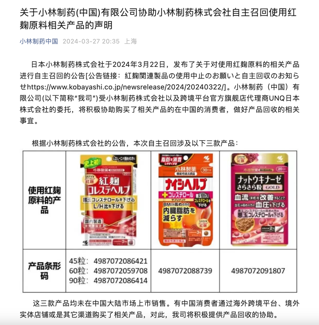 根据报道,今年1月,小林制药就收到公司保健品服用者健康受损的报告,但直到3月22日,它才对外公开“红曲胆固醇颗粒”产品出现问题,并启动自主回收问题产品的程序。