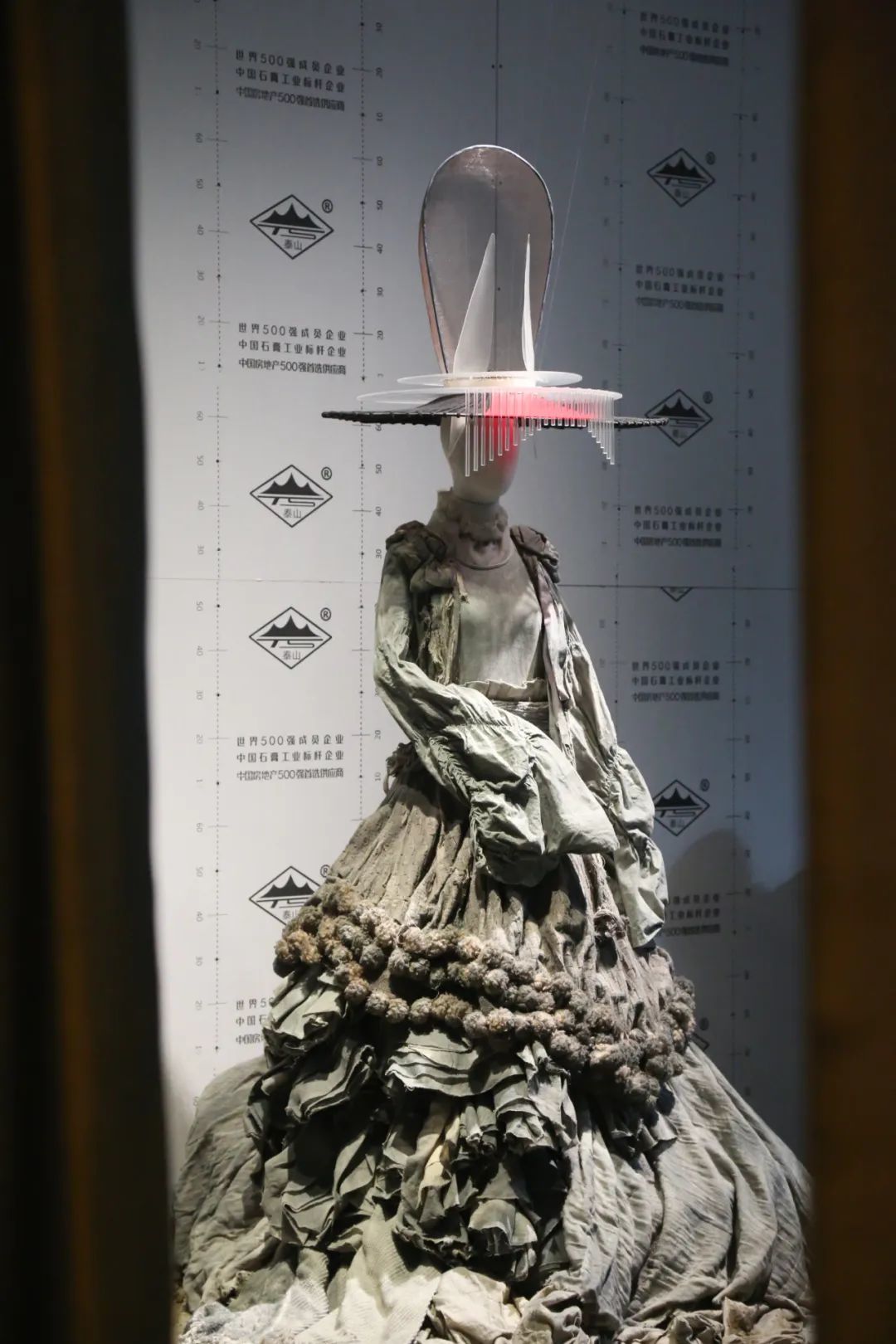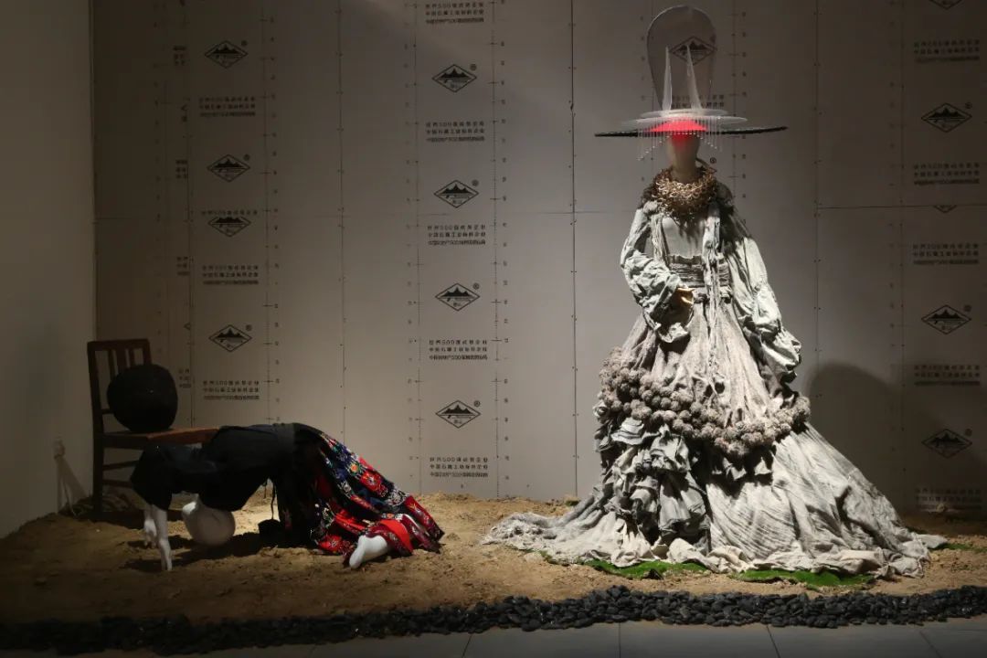 本次展览,阿朵还为我们带来了服装装置作品《复活》,这是阿朵时隔5年后、在2017年正式复出的第一张专辑《死里复活》中,以专辑概念创作的一套服装及头饰。裙身经过手工染色,不同肌理的土布堆叠出纹路细节,创造出从泥土生长出来的生命力量感,头饰的制作更多使用了现代工艺和材质,融合了民族轮廓与服装质感的碰撞。