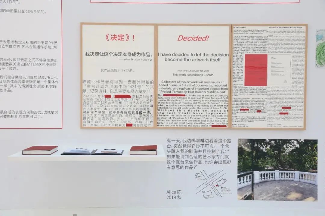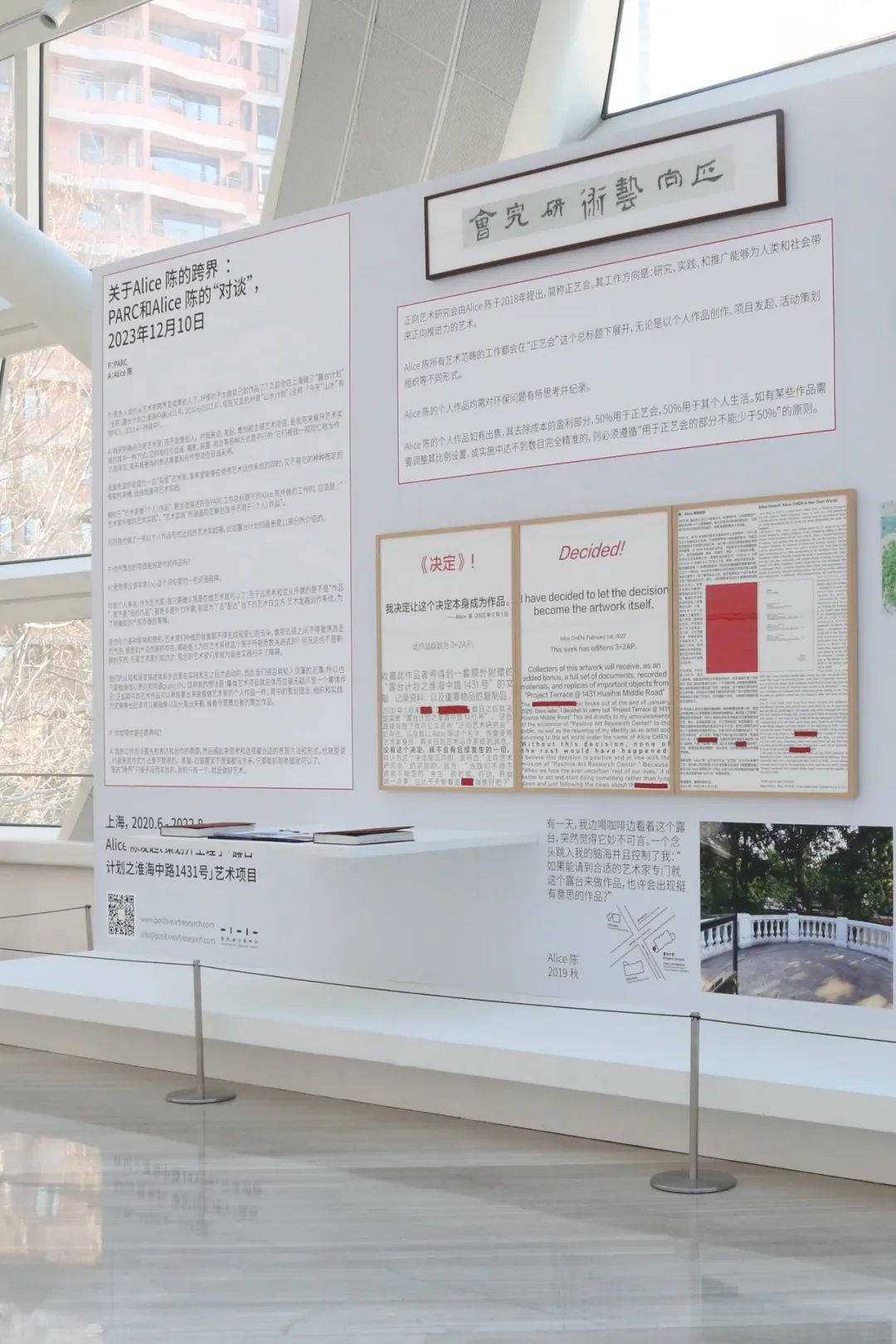 在陈羚羊退出艺坛的15年里,她理解了圈外人看中国当代艺术的心态,但她认为她从未离开艺术。2018年,她创建了“正向艺术研究会”,以研究、实践和推广能够为人类和社会带来正向推进力的艺术为工作方向。2020年,陈羚羊公开宣布以Alice陈之名恢复使用艺术家身份,回到艺术运作系统。本次展览呈现的是由她发起并策划、主理的长期艺术项目,包括2020年6月至2022年8月的《露台计划之淮海中路1431号》以及2023年4月开始的《今天“山水”有用吗?》的相关影像、文献资料。