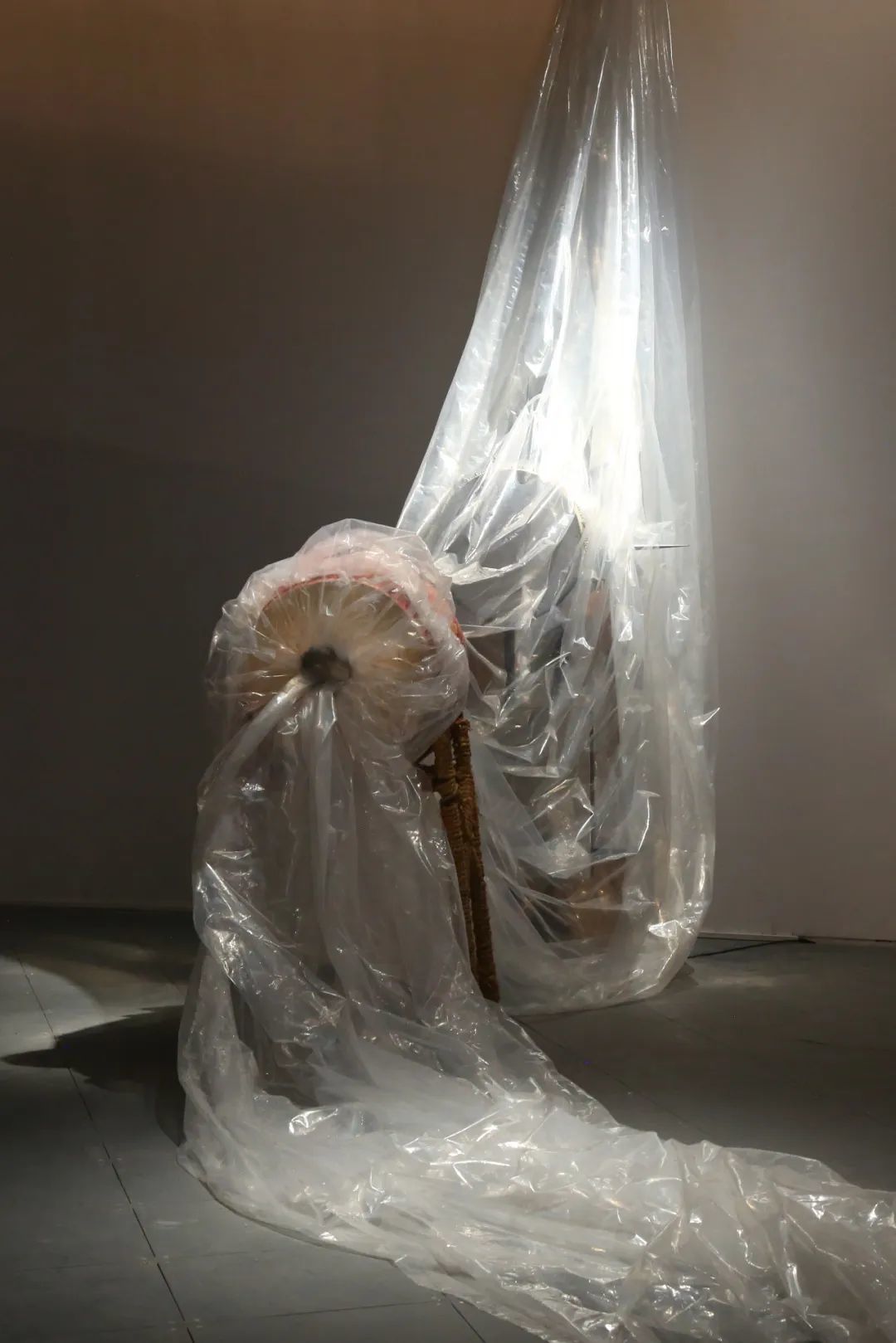 ▲ 阿朵,服装装置作品,《复活》,底边裙摆直径140-150cm左右,高度约200cm,土布、手工染、树脂,2017。“了不起的‘她们’”——福布斯中国致敬 卓越女性艺术家邀请展”展览现场,凤凰中心,2024