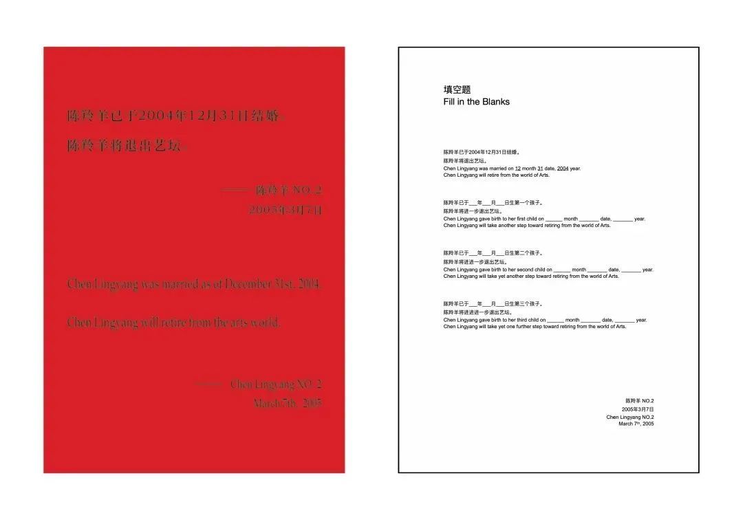 2005年,陈羚羊宣布退出艺坛,主动摆脱了当代艺术圈的运行轨道。她用反讽的方式,以婚姻为由,留下一道《填空题》,转身离开,将艺术转化成完全私人的事情。