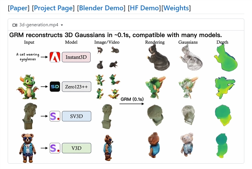 GRM的强大之处在于其能够处理来自多种数据源的输入,包括但不限于Zero123++、Instant3D、V3D、SV3D等。这种灵活性和适应性使得GRM在3D建模领域具有广泛的应用前景。