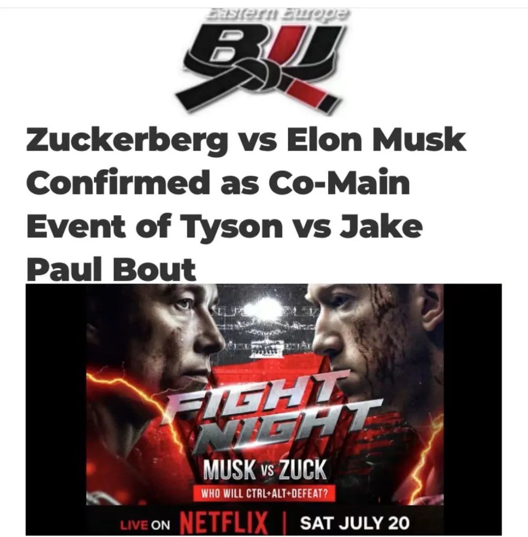 昨天,国外柔术媒体网站Bjjee报道了一条大新闻,其称7月20日泰森vs网红拳手杰克·保罗比赛的主办方宣布,埃隆-马斯克(Elon Musk)与马克-扎克伯格(Mark Zuckerberg)的大战也将在这场对决中上演,并且双方将采取特殊的MMA规则展开对决。