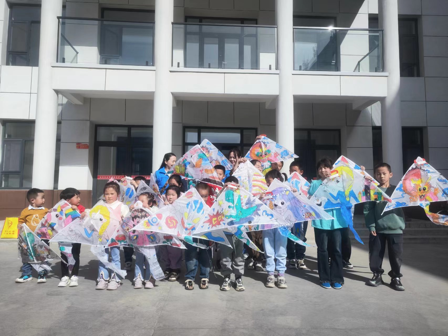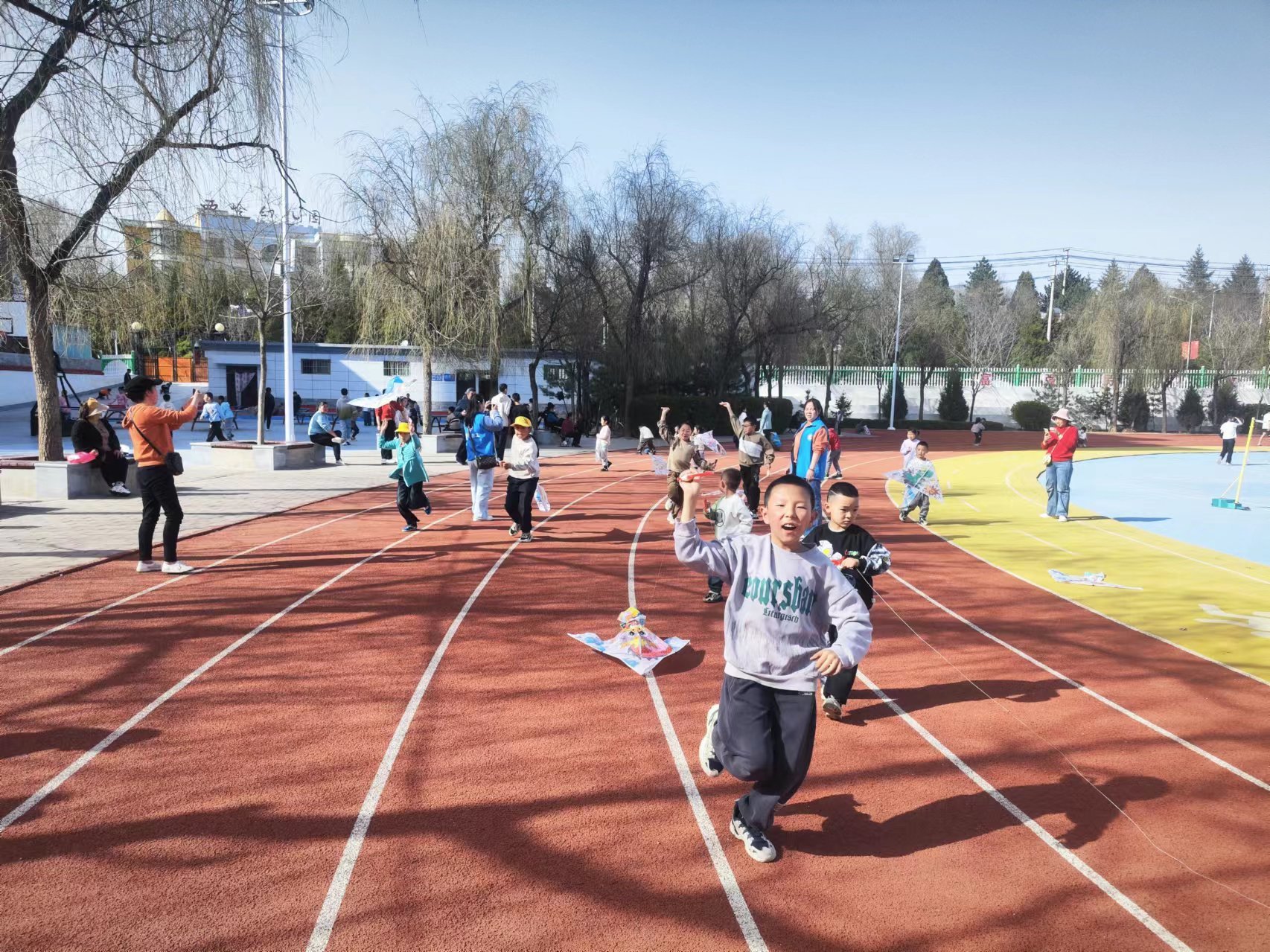 风筝绘画完成后,家长和孩子们纷纷在体育场放飞风筝。线儿越放越长,风筝越飞越高,迎着徐徐春风将自己的小小梦想和风筝一起放飞在高高的蓝天上,各种不同图案的风筝在天空中竞相追逐,他们牵着细线,奔跑者,欢笑着,一起在大自然中尽享乐趣。