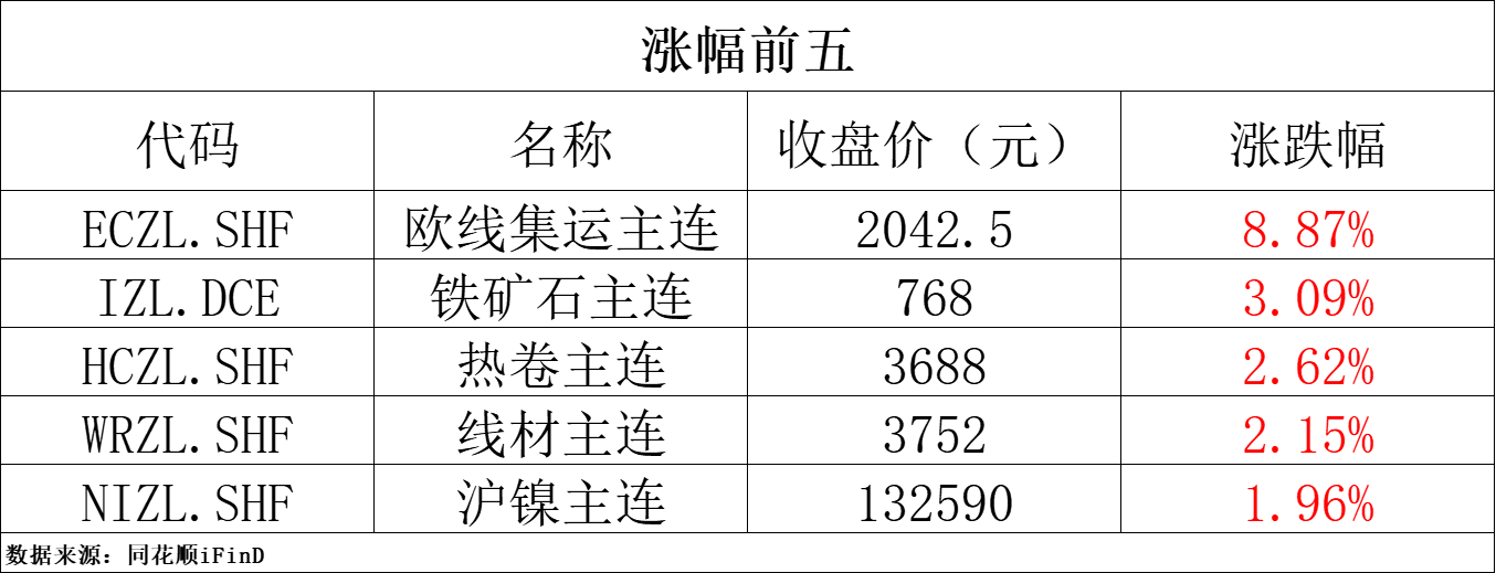 4月2日,国内商品期货收盘,多数上涨。集运欧线涨超8%,铁矿石涨超3%,热卷涨逾2%,工业硅、菜籽油等涨超1%,棉花、沪铜等小幅上涨;红枣跌超1%,玻璃、鸡蛋等小幅下跌。