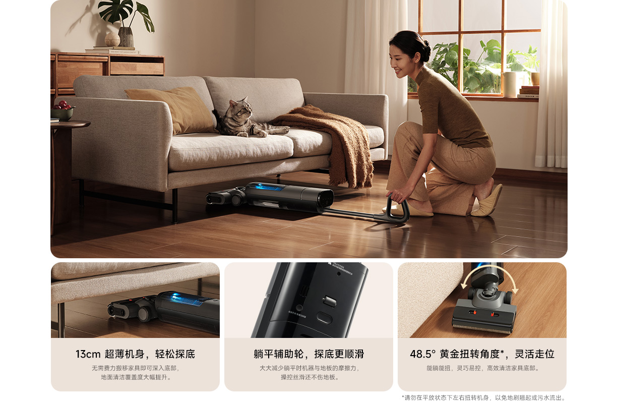 这款洗地机的主要升级点还是在于形态的变化上,它做了“超薄”设计,机身可以薄至 13cm,结合可以 180° 打开的转轴,可以探入到更多家居的底部。它甚至开发了 Superplana 2.0 躺平技术,可以分离水气,避免在躺平时候污水干扰风机和吸力减弱的现象。