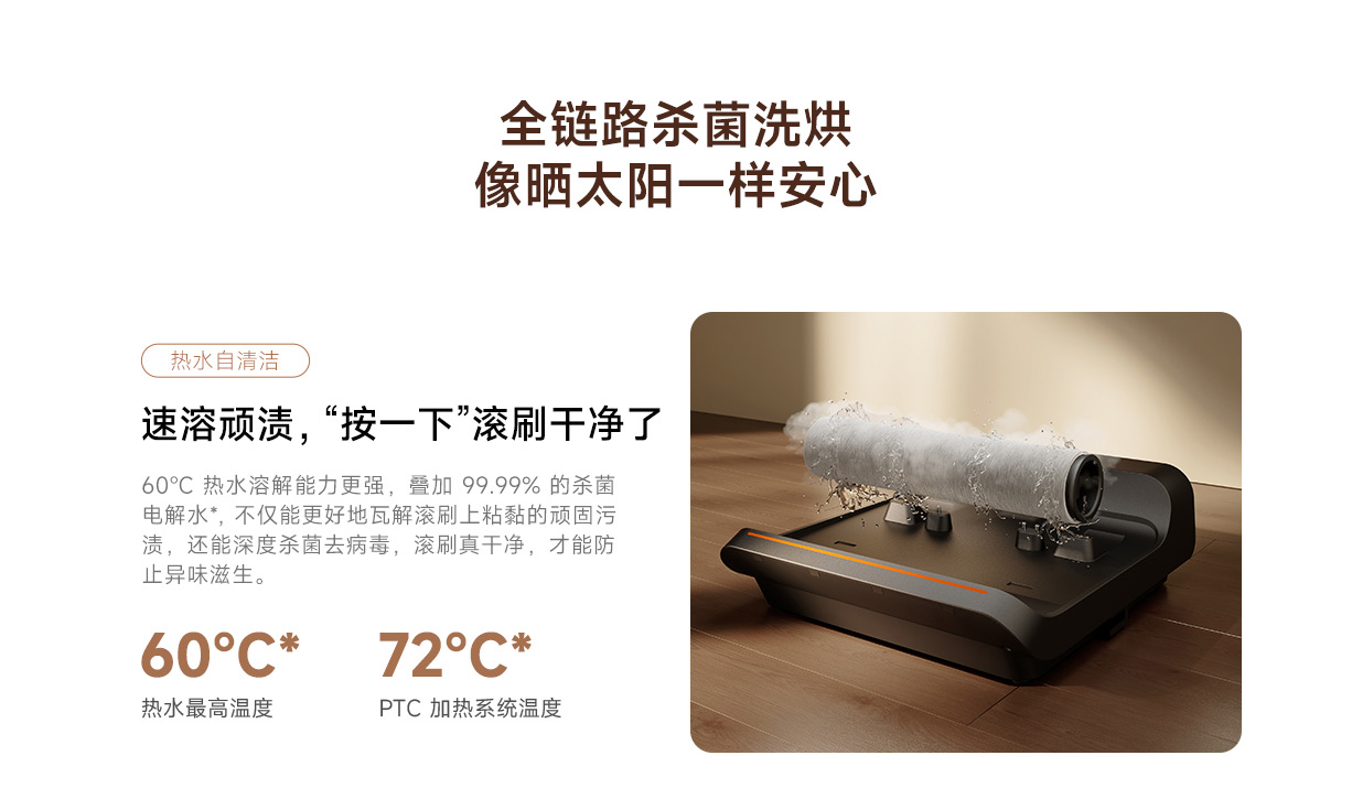 米家无线洗地机 3 Pro 还配备了热水自清洁功能,可以提供最高 60℃ 的热水,与 99.99% 的杀菌电解水相得益彰,自清洁结束后还有热风烘干功能,帮助滚刷保持干燥。