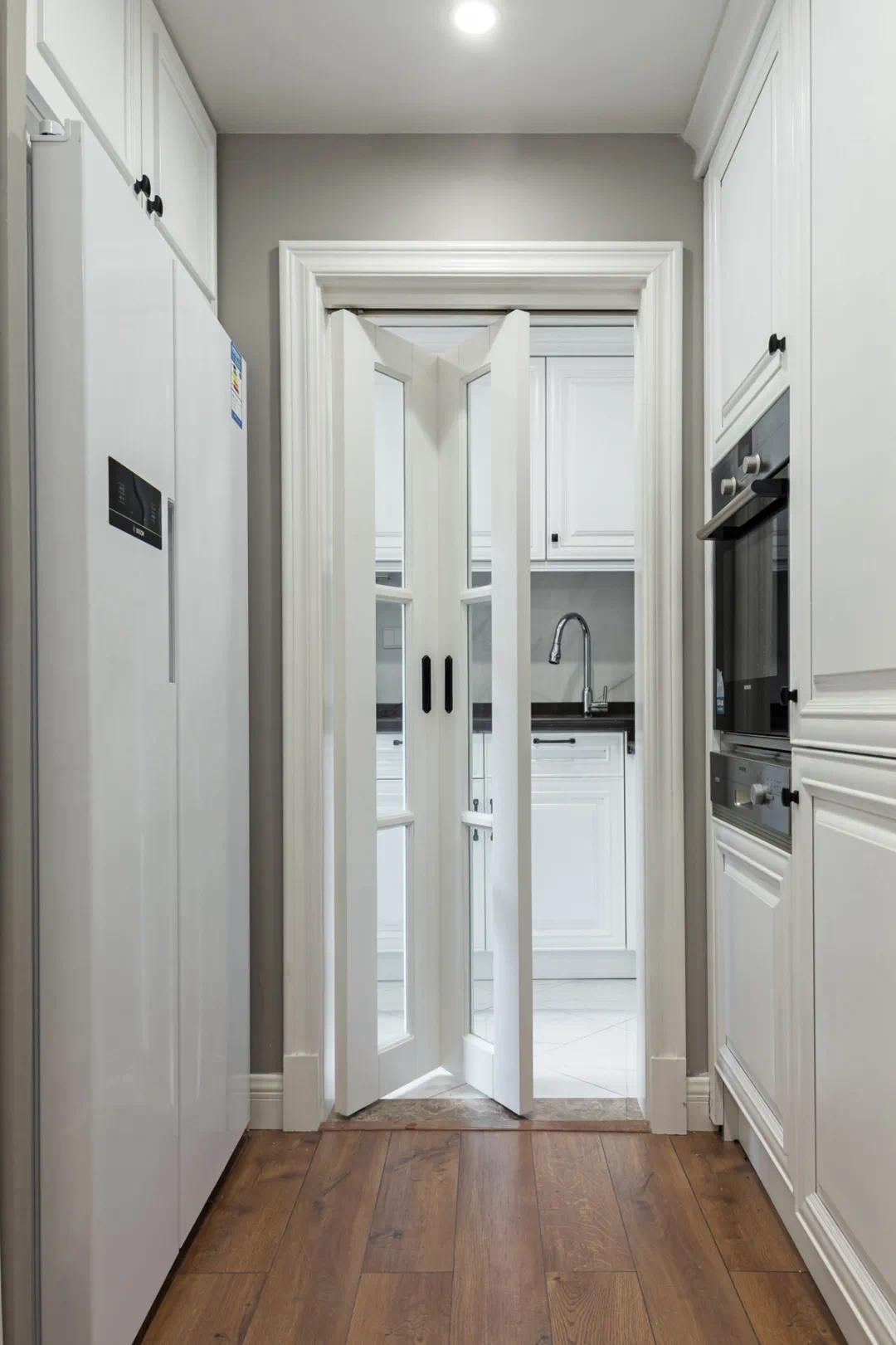 一般如果不是开放式厨房的话,厨房门洞一般都只有一扇门左右宽度,所以对于这样的小门洞、内部空间又小的,选择门扇窄一点的折叠门,更加节省空间。