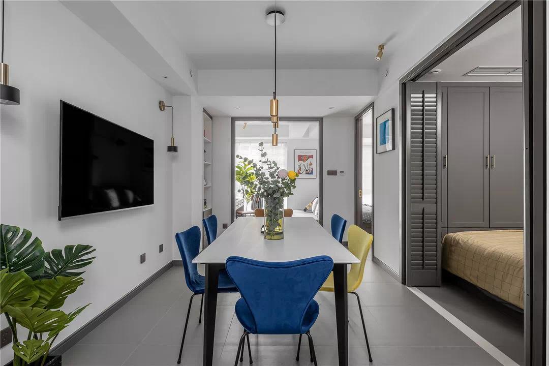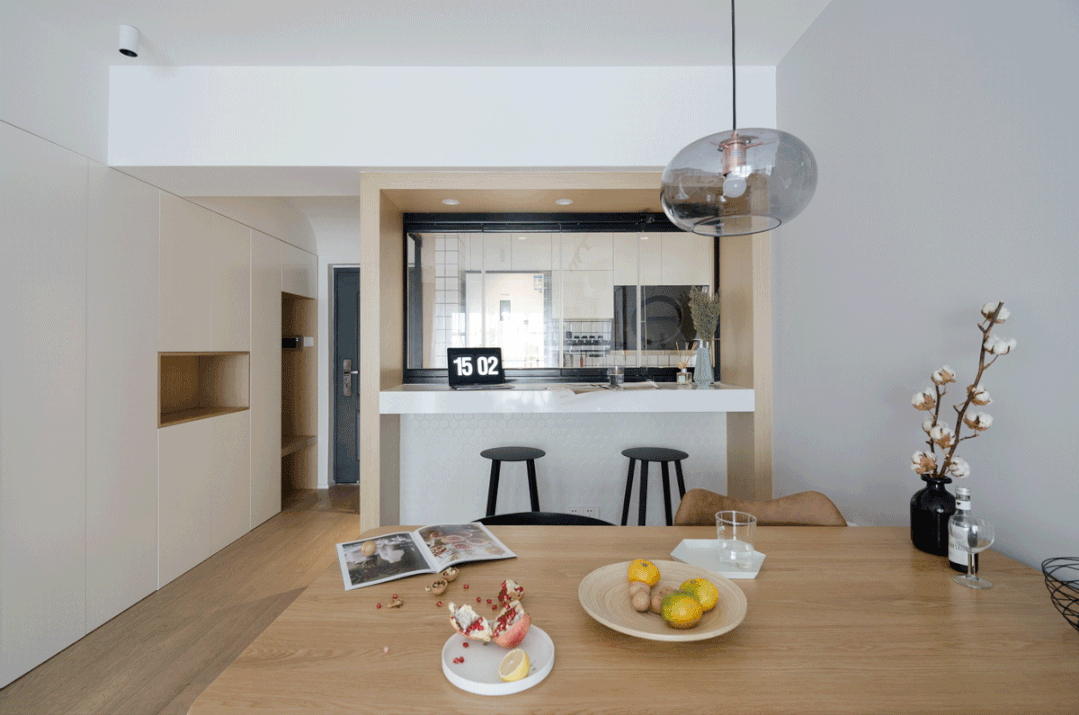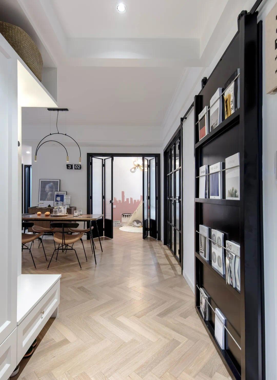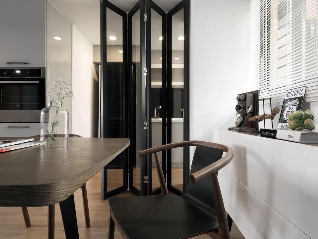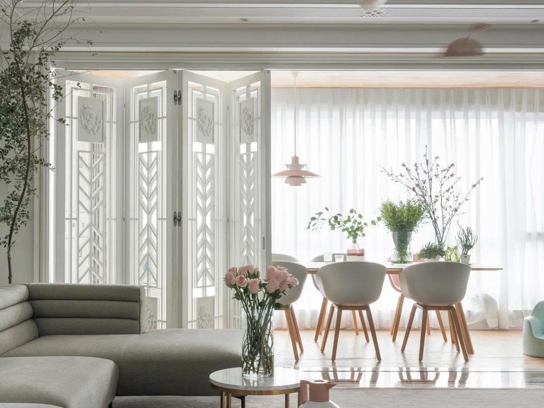 折叠门划分出一个独立的餐厅空间,既可以让用餐更加具有仪式感,也使餐厅功能更加明确,更加独立,丰富餐厅层次感和设计感。