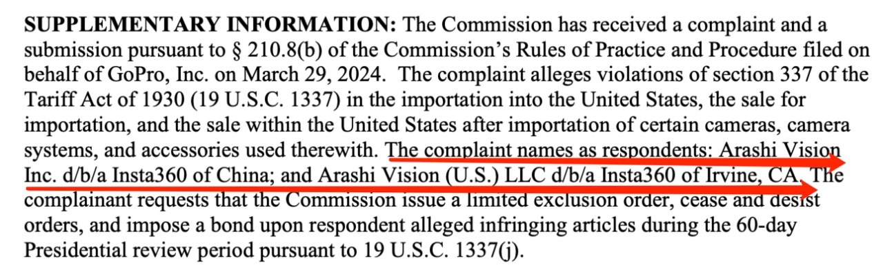 4月2日,有市场消息称,美国GoPro公司于2024年3月29日依据《美国1930年关税法》第337节规定,向美国国际贸易委员会提起申请,指控某些相机及相关产品侵犯其专利权,并请求进行337调查。