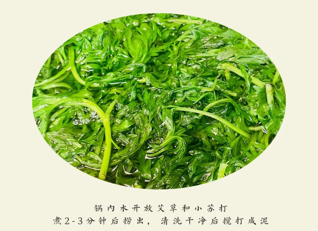 1,锅内水开放艾草和小苏打,煮2-3分钟后捞出,清洗干净后搅打成泥