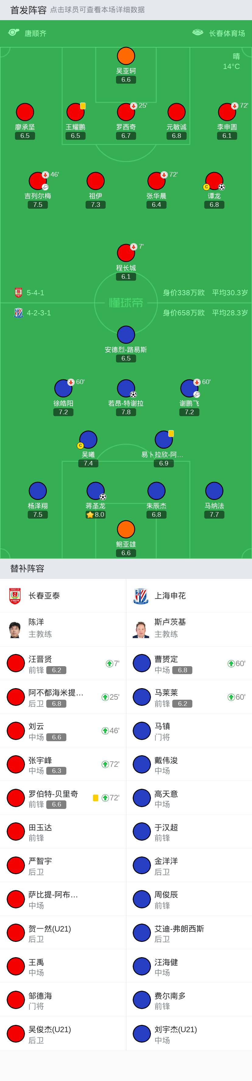 长春亚泰首发:40-吉列尔梅, 13-程长城, 29-谭龙, 44-祖伊, 23-吴亚轲, 4-罗西奇, 19-廖承坚, 3-王耀鹏, 6-张华晨, 26-元敏诚, 5-李申圆
