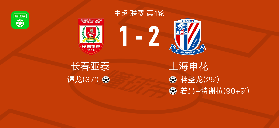 北京时间4月5日中超 联赛 第4轮,长春亚泰主场对阵上海申花。长春亚泰谭龙破门。上海申花蒋圣龙破门,若昂-特谢拉破门。最终比分长春亚泰1-2上海申花。