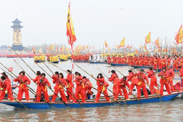 “世界上最大的水上庙会”溱潼会船是一场“旷世‘船’奇”和“四海宾朋”的风云际会。龙佑三水、龙飞凤舞、龙腾溱湖、龙兴姜城等8条贡船率先登场,气势恢宏;象征着风调雨顺、五谷丰登的龙船方阵紧随其后,活灵活现;来自友邻县市区的6条竞速篙船飞速驶来,犹如蛟龙出海;35条来自姜堰各镇街的竞速赛船,你追我赶;还有400多条篙子船乘风破浪而来:80条由清一色娘子军组成的划子船编队,激浪前行……500多条各式各样的船只和上万名会船选手飞篙走桨,弄潮击浪。