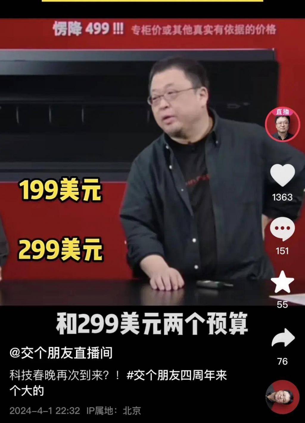 近期在交个朋友的四周年专场直播中,罗永浩向外界透露,自己即将在今年 9 月份推出科技产品,并呼吁粉丝准备好 199 美元和 299 美元两个预算。
