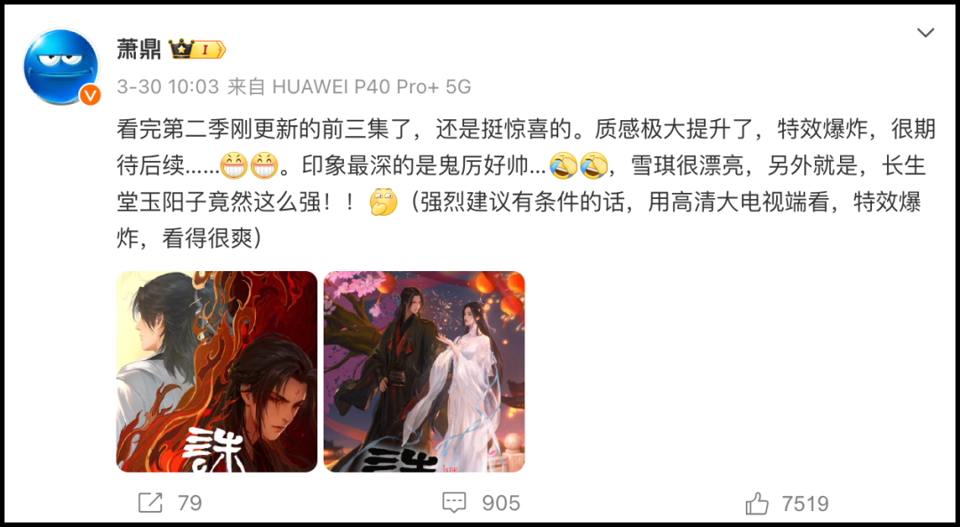“特效爆炸,很期待后续……长生堂玉阳子竟然这么强!!强烈建议有条件的话,用高清大电视端看,特效爆炸,看得很爽。”