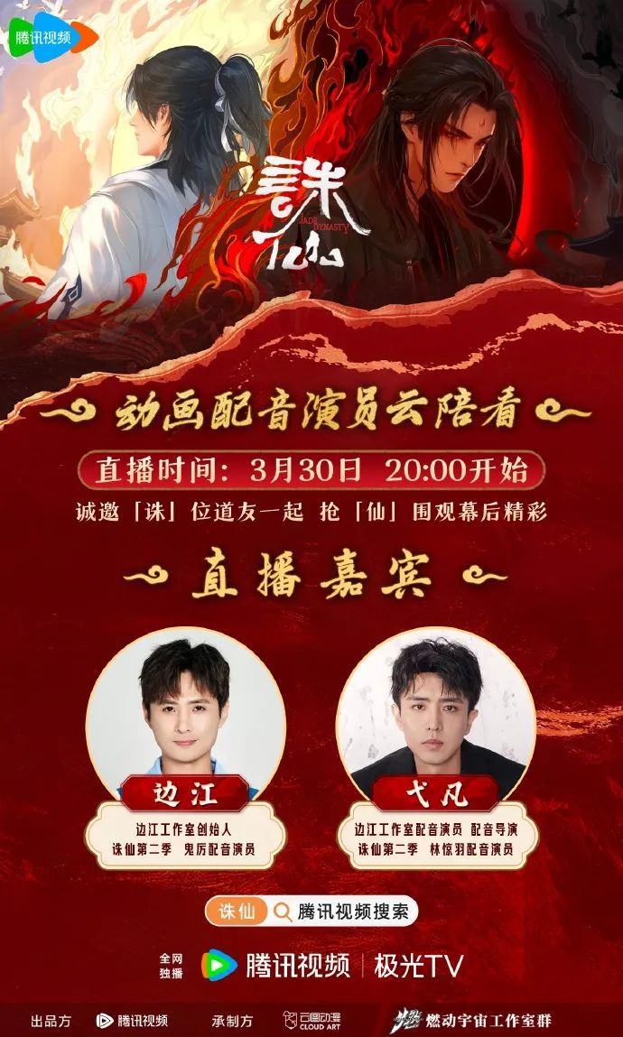 开播当天,腾讯视频还邀请《诛仙2》动画的配音演员边江(鬼厉配音)、弋凡(林惊羽配音)陪看陪聊。