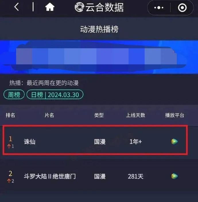 云合数据动漫热播榜第一位、腾讯视频动漫热播榜首位……