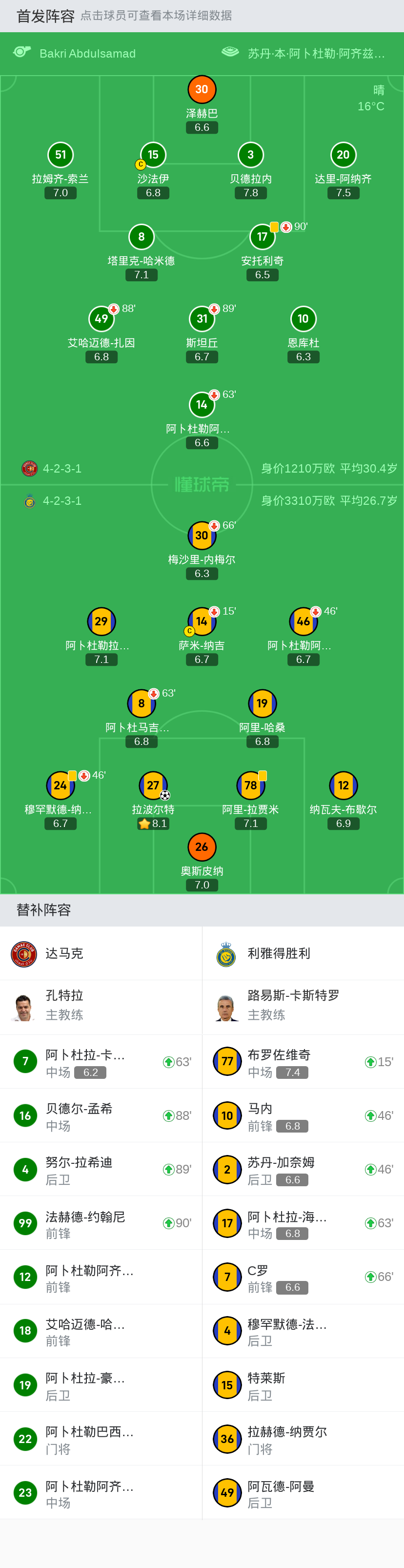 上场替补:66分钟7-C罗, 15分钟77-布罗佐维奇, 46分钟10-马内, 46分钟2-苏丹-加奈姆, 63分钟17-阿卜杜拉-海巴里