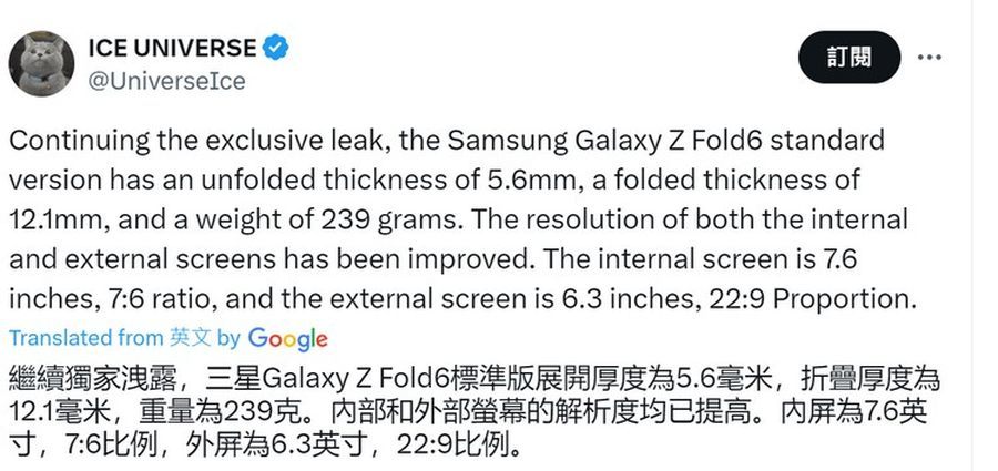 此外,三星Galaxy Z Fold6还有传闻6.3英寸的外屏将会改用22:9屏幕比例,7.6英寸折叠内屏将改为7:6比例屏幕,估计机身外型上会有一定改变。