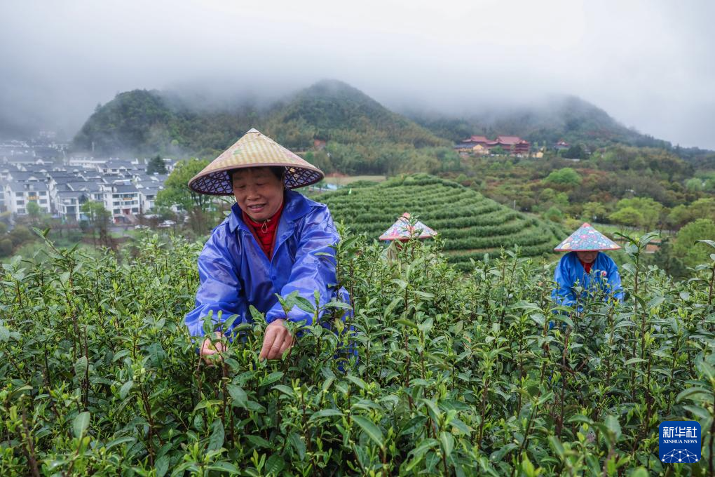4月7日,在浙江金华的金华山鹿田村的婺州举岩茶基地,茶农采摘举岩茶鲜叶。