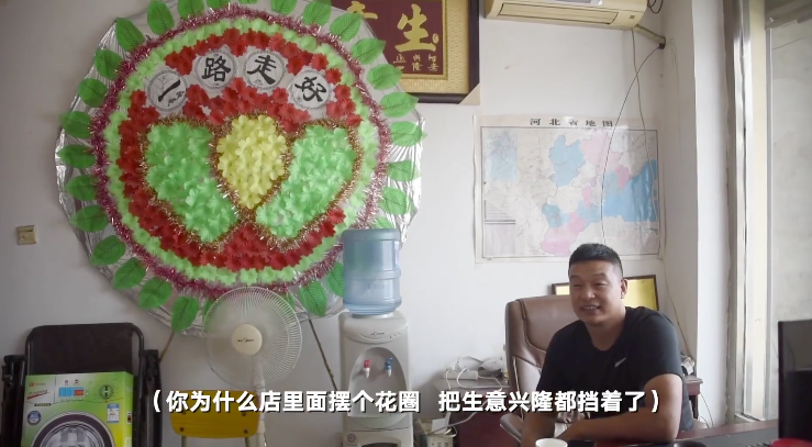 门店上的“超强寿盒”、“兴武绢花厂”、“天道寿衣厂”、“秀江泡沫楼房”、“国磊殡葬大全”等字样,昭示着这里在殡葬用品领域的专业度。