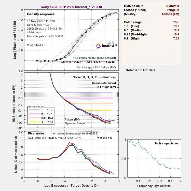 其实细节在魔鬼当中,动态范围不仅要捕捉还涉及显示,其中噪点(Noise,对应中文是噪声,但是习惯称为噪点)的多少直接影响到显示效果,CineD在制定测试标准时曾表示,电影机动态范围没有一个行业标准,因此在制定测量方式时参考了针对数码相机噪声测量标准ISO-15739:2003,而且给出了基于Patch range、1.0(Low)、0.5(Medium)、0.25(Med-High)、0.5(High)多个不同信噪比的动态范围值。