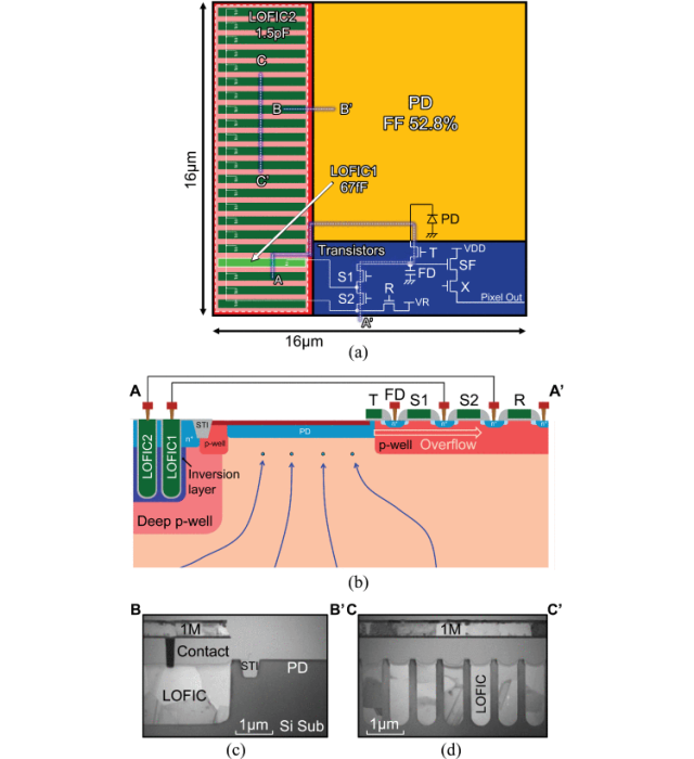 荣耀Magic6至臻版所用H9800同样是一块“小传感器”(1/1.3英寸),但是使用LOFIC技术,像素边上放了一个高密度电容,用来收纳因为饱和而溢出的电子,其结构有点像是园林设计中常见的多层水池,在小水池(像素)的水(电子)溢出后会自动流入的大水桶(高密度电容),有效提升了满阱电子容纳能力FWC(Full well capacity),进而提供动态范围。