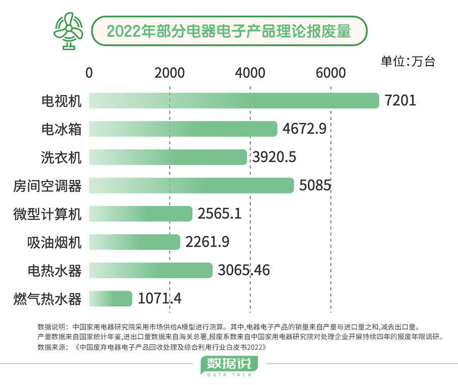 还有一组数据可参考,《中国废弃电器电子产品回收处理及综合利用行业白皮书2022》显示,中国家用电器研究院采用相关模型测算了废弃电器电子产品的理论报废量,测算结果显示,2022年,电视机、电冰箱、洗衣机、房间空调器、微型计算机的理论报废量约为2.34亿台,以各地区的人口数和GDP为权重测算,广东、江苏、山东、河南为这些产品理论报废量较大的地区。