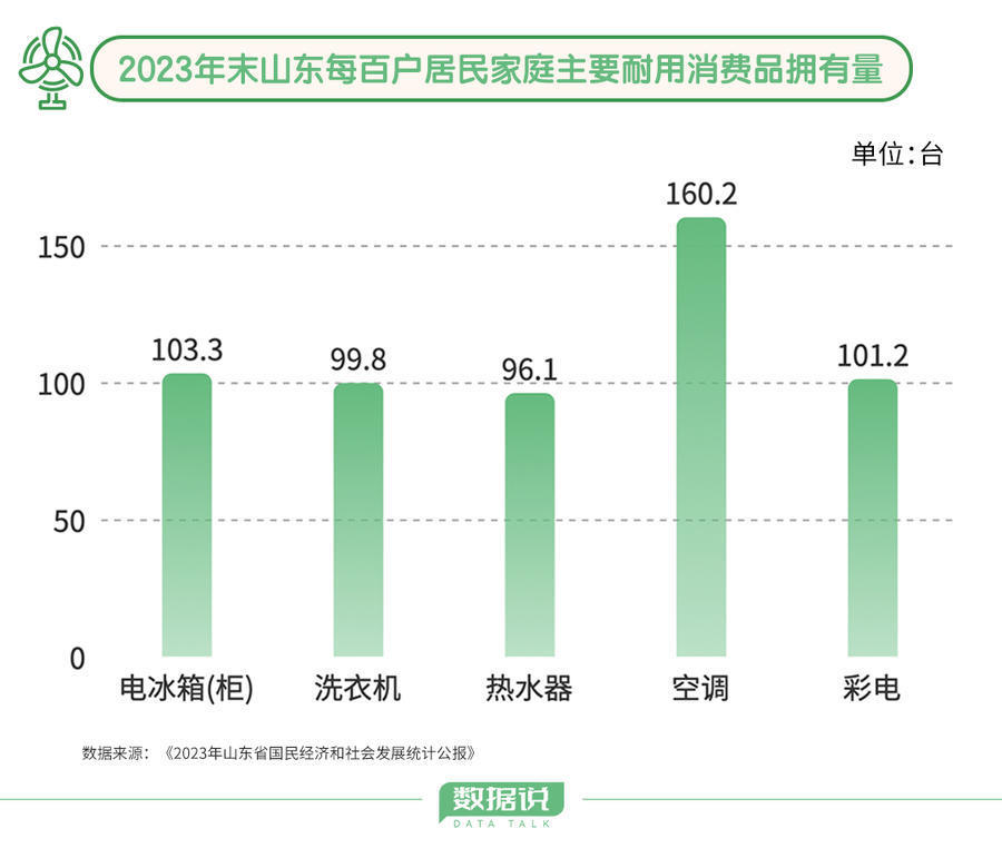 从山东来看,各类家电的保有量如何呢?《2023年山东省国民经济和社会发展统计公报》显示,2023年末,山东每百户居民家庭中电冰箱(柜)、空调、彩电拥有量都超过100台,洗衣机接近100台,热水器稍少,但也达到每百户96.1台。