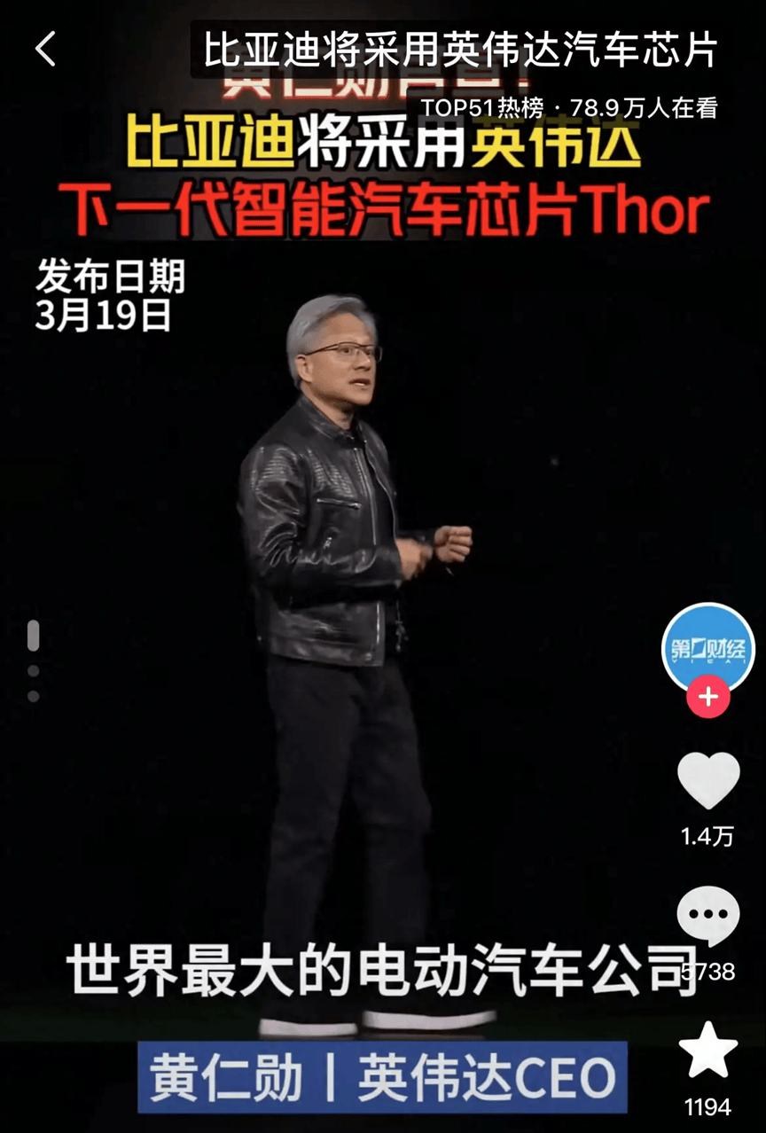 英伟达在2024年GTC大会上宣布,比亚迪将采用其下一代智能汽车芯片Thor。