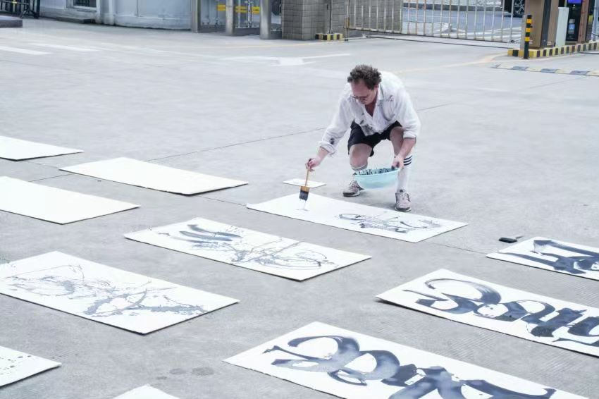 嘉宾们剪彩完成后,大家在木星美术馆的广场前,来自荷兰阿姆斯特丹的艺术家 Shoe 进行了现场的表演创作。