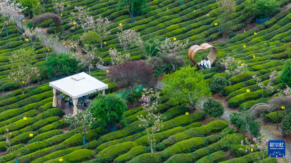 4月5日,游客在安徽省黄山市徽州区谢裕大茶博园游玩(无人机照片)。新华社发(樊成柱摄)