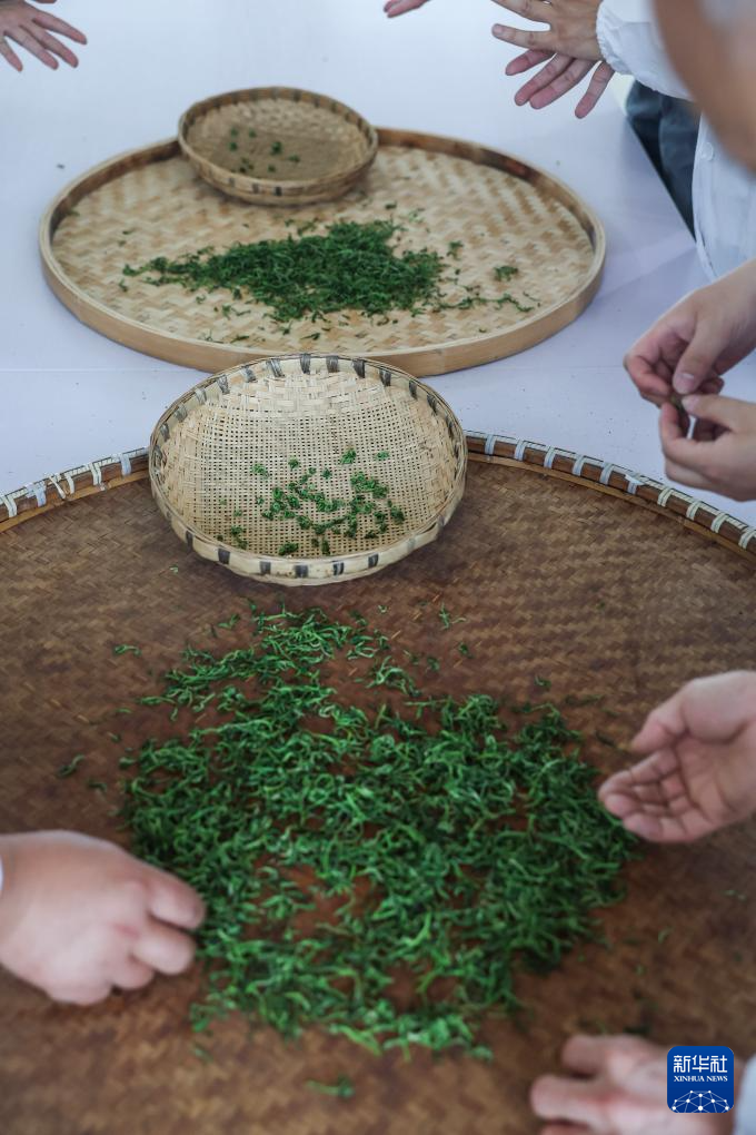 4月8日,在浙江杭州富阳区里山镇安顶村共富工坊内,茶农在查看刚刚采收下来的安顶云雾茶鲜叶。新华社记者 徐昱 摄