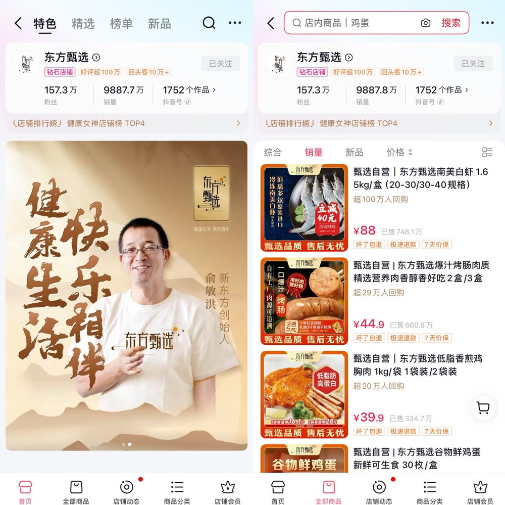 在销售成绩上,东方甄选热销前三名产品均为生鲜食品。目前南美白虾产品在抖音渠道已售748.1万单,自营烤肠已售660.8万单,低脂香煎鸡胸肉已售334.7万单。