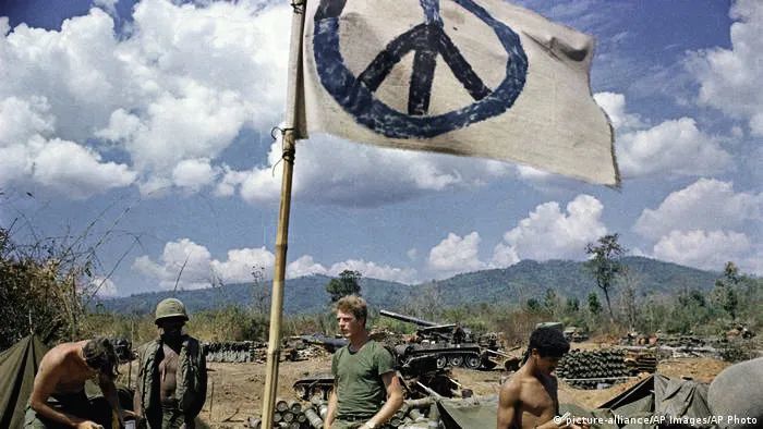 在越南战场上,美国军人升起绘有反战符号的旗帜