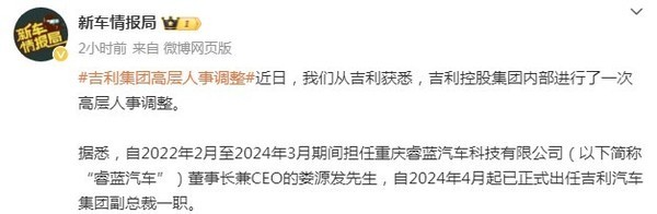 【智车派新闻】4月9日,据@新车情报局 消息,吉利控股集团内部进行了一次高层人事调整,自2022年2月至2024年3月期间担任重庆睿蓝汽车科技有限公司(以下简称“睿蓝汽车”)董事长兼CEO的娄源发先生,自2024年4月起已正式出任吉利汽车集团副总裁一职。