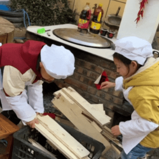 小朋友有负责拾柴烧火的,有负责洗碗洗菜的。