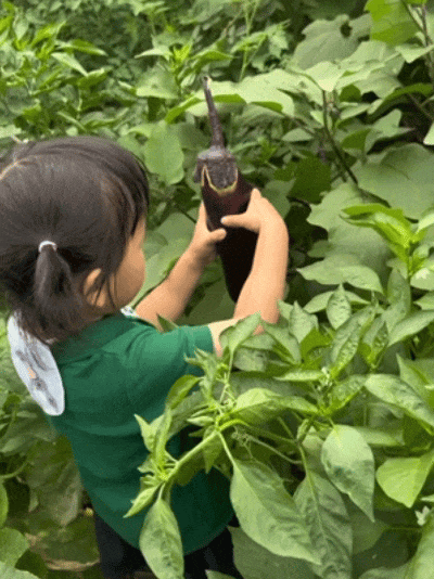 个子还没菜高呢,就自己踩着泥泞钻进田里抱出茄子、黄瓜、青椒。