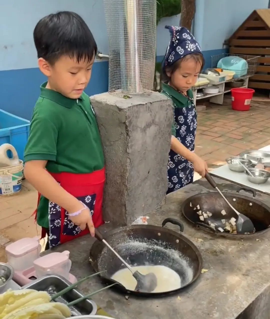 这些灶台,都是根据孩子的身高定制的。