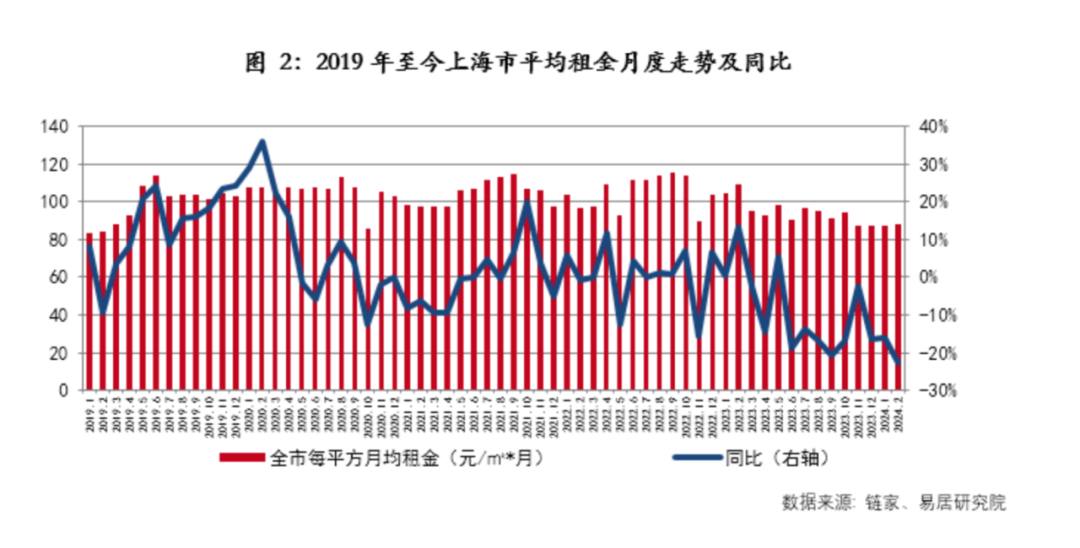 据易居研究院数据,截至2月,上海市全市挂牌房源的每平米月租金为87.8元/平/月,同比下跌22.6%,同比跌幅创2019年至今历史最大幅度。相比于2023年上海全年平均租金95.2元/平/月,当前的房租下跌了7.4元,降幅为7.8%。
